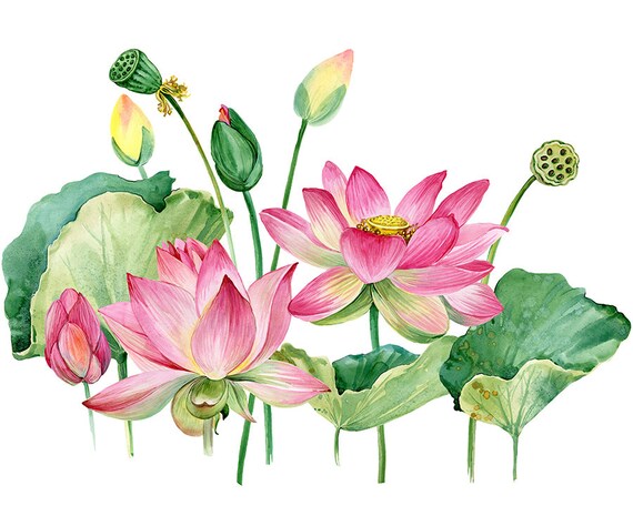 Watercolour Lotus Flowers Leaves Clip Art Graphic Design PNG
